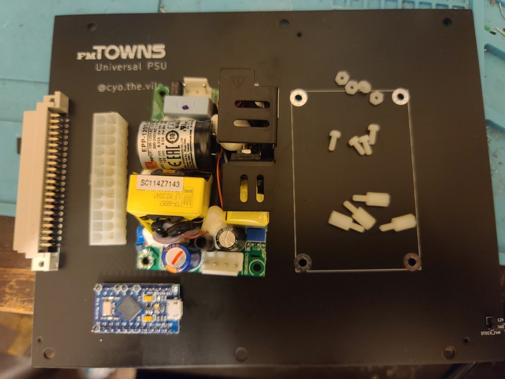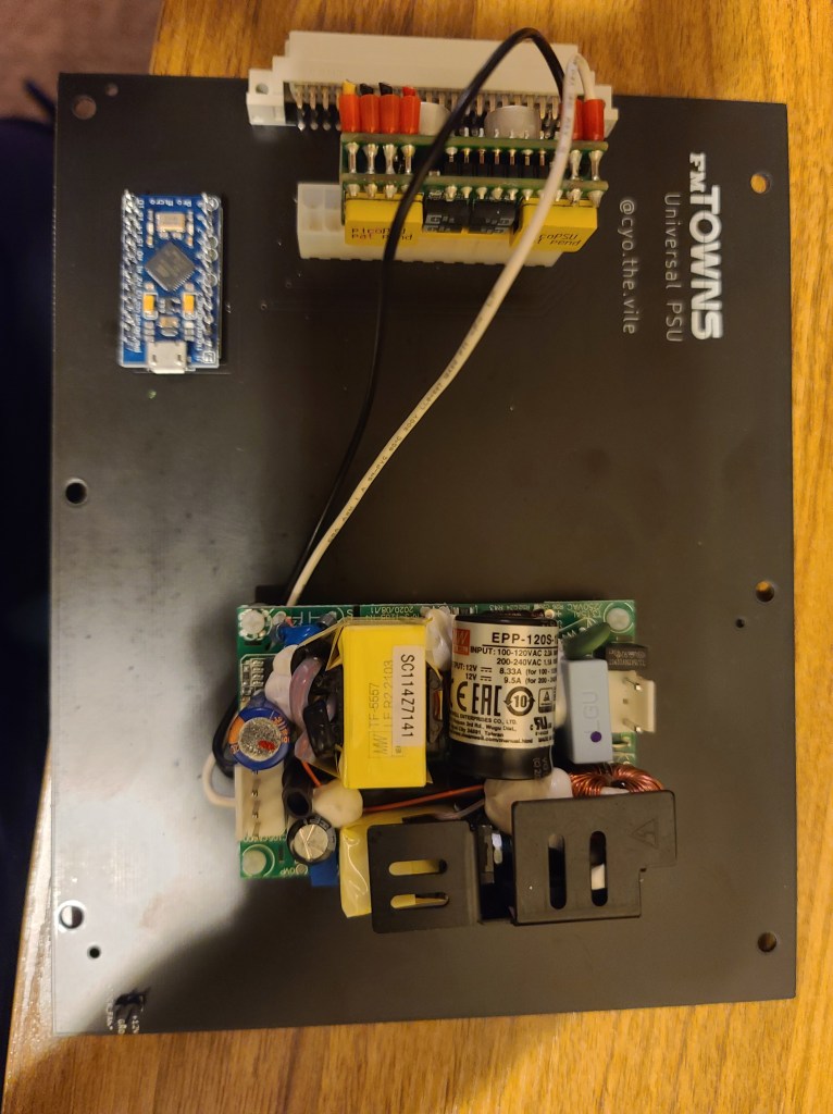 This new power supply runs with an AC/DC Converter and ITX Pico-PSU. The AC/DC Converter used is the Meanwell EPS-120S-12 and the Pico Psu rated for 120 watts. The Arduino Pro Micro manipulates the PS_ON line from the Pico PSU whenever the power button is pressed and TownsOS Power off is initiated. This exact concept is also attempting to be ported for a universal PSU card for desktop FM towns.