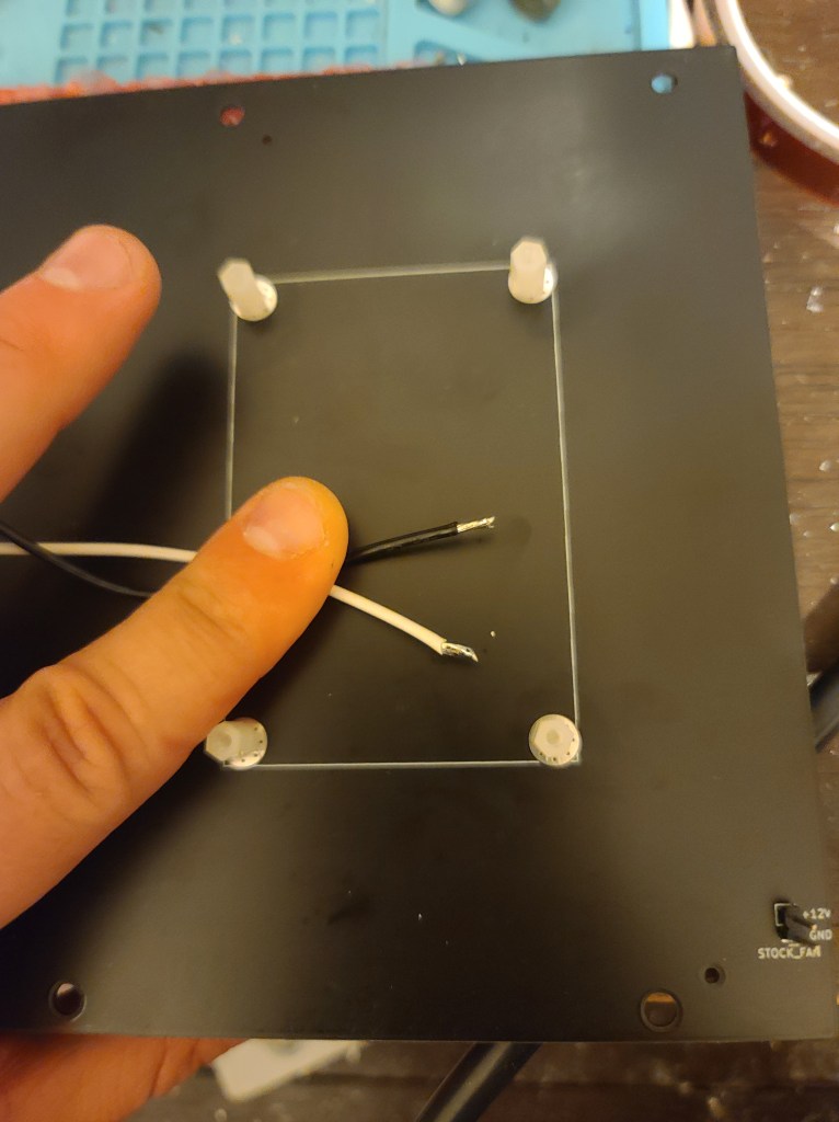Your PSU should now look something like this. Well, don’t attach the screws in the photo. I forgot to take a photo but solder the two 2.54mm PIN HEADER to the STOCK_FAN area.