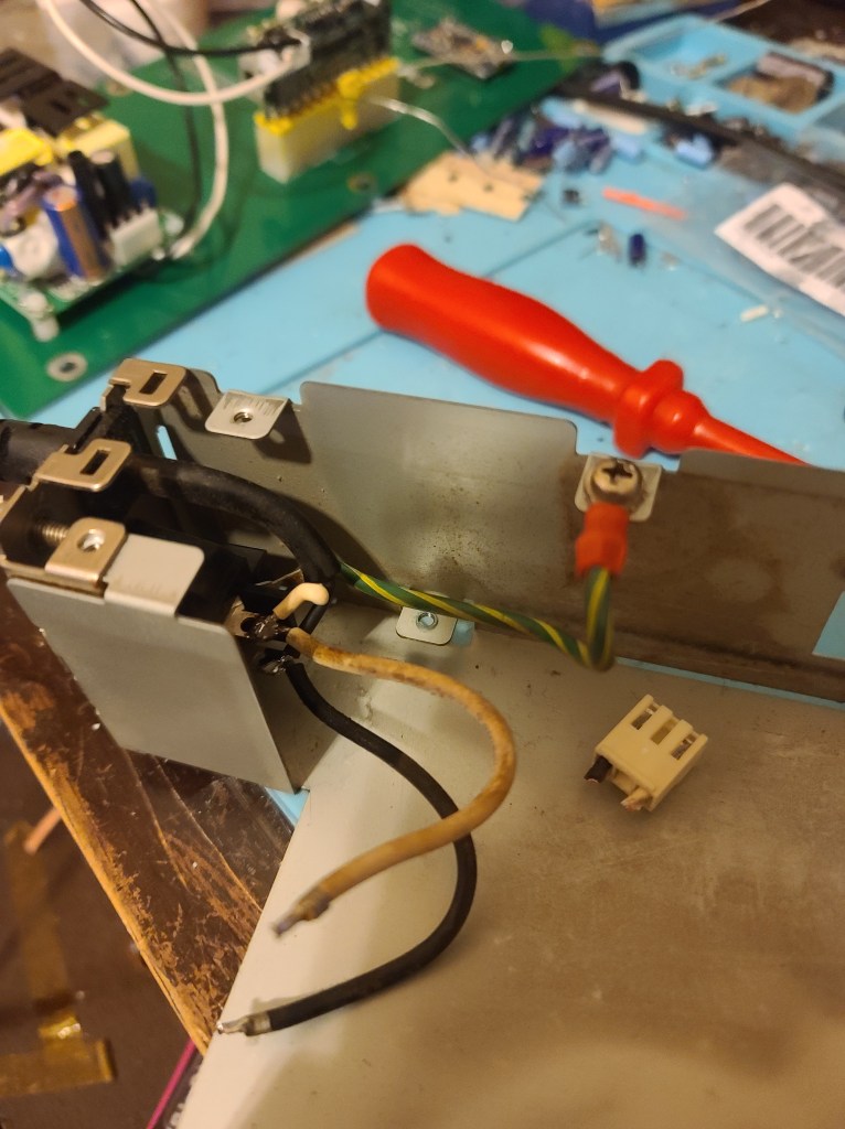 On the metal PSU shield, cut the plug. In the photo you will see I also stripped the wire a bit. Tin the wires and solder them back into the receptable.