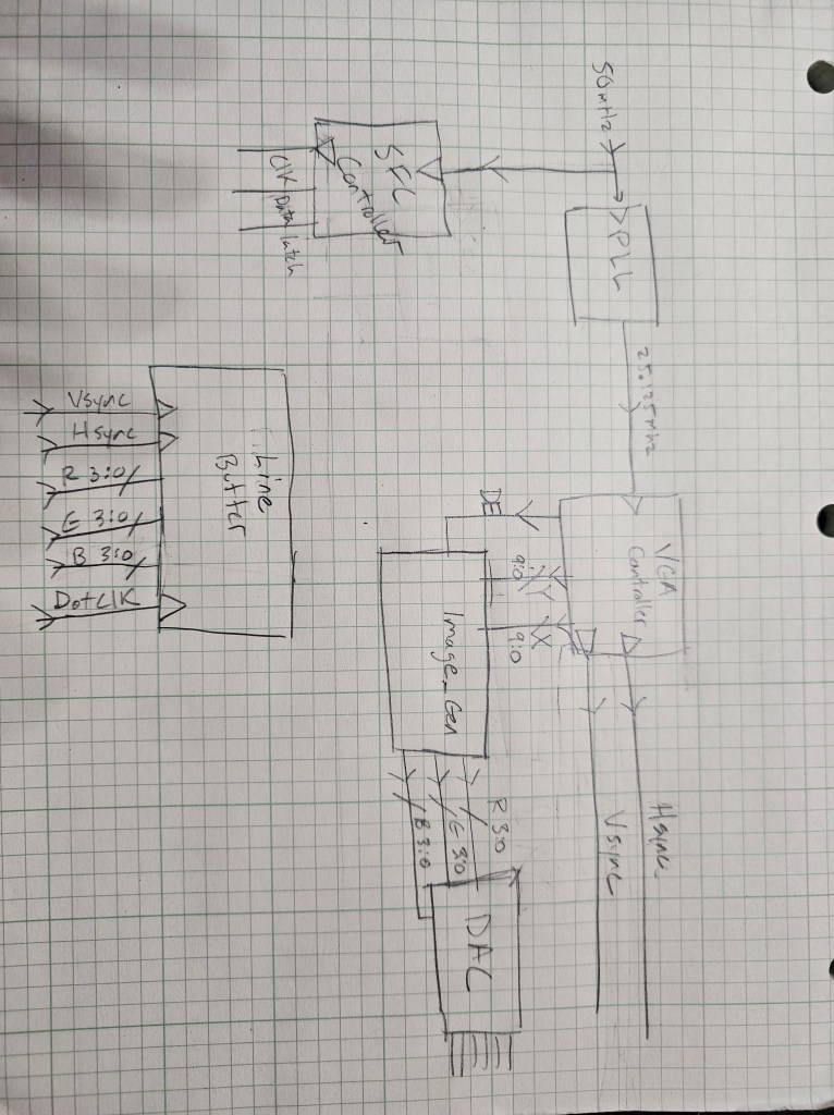 Here is a very hazardly high-level design of the pipeline that I’ll be designing. SFC Controller, NG Controller logic, VGA controller and Line buffer all work. The image generator along with pixel and line multiplication will be the biggest challenge. There should be borderline zero latency with this approach as it will draw and multiply as the screen data comes out of the NGPC.