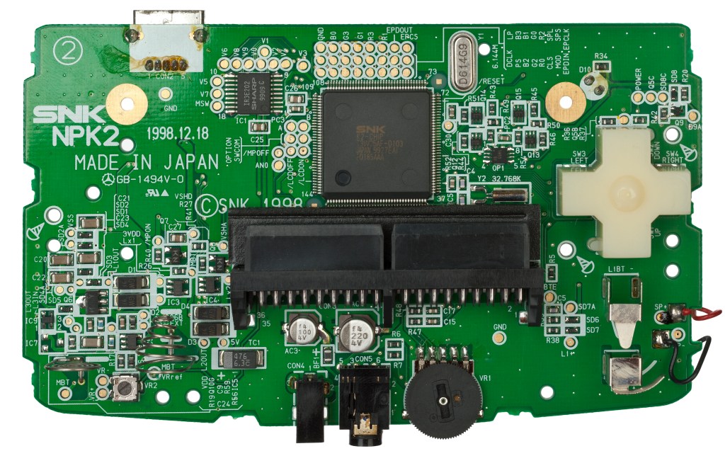 So let’s go over the specifics about NGPC. The colors are output at a depth of 4 bits per color. The Gameboy Advance on the other hand was 5 bits of color depth. So color selection is a bit more limited by comparison. The NGPC has an SoC called the K2 as the primary CPU which does cartridge reading, analog sound output, and digital RGB output which goes into an LCD. Here is a stock image of the board.