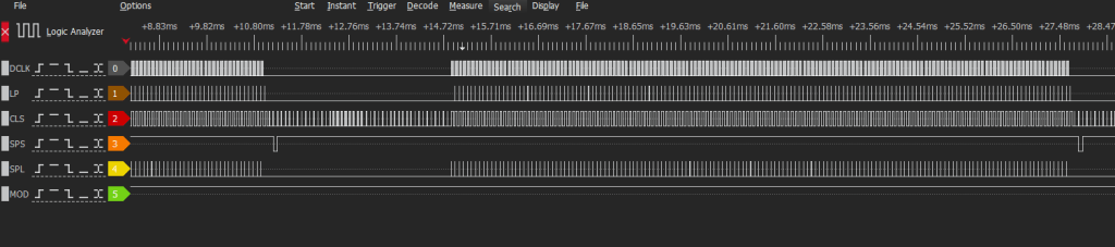 Here are the signals that are significant to us: R0 to R3, B0 to B3, G0 to G3, DCLK, SPS and SPL. The reason I know SPS is the vertical and SPL is the horizontal was due to the activity on the NGPC screen when I would ground those lines. The DCLK is what we would know as a pixel clock. The SPS also has a negative sync polarity which is visible on this capture here. I’ve concluded there is no DE or “data enable” signal for this CPU + LCD combo.