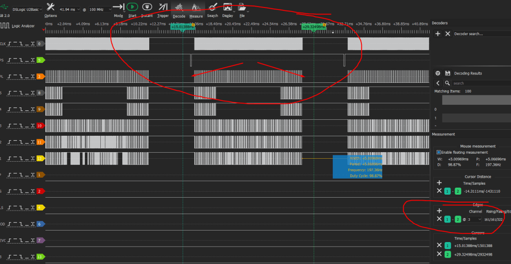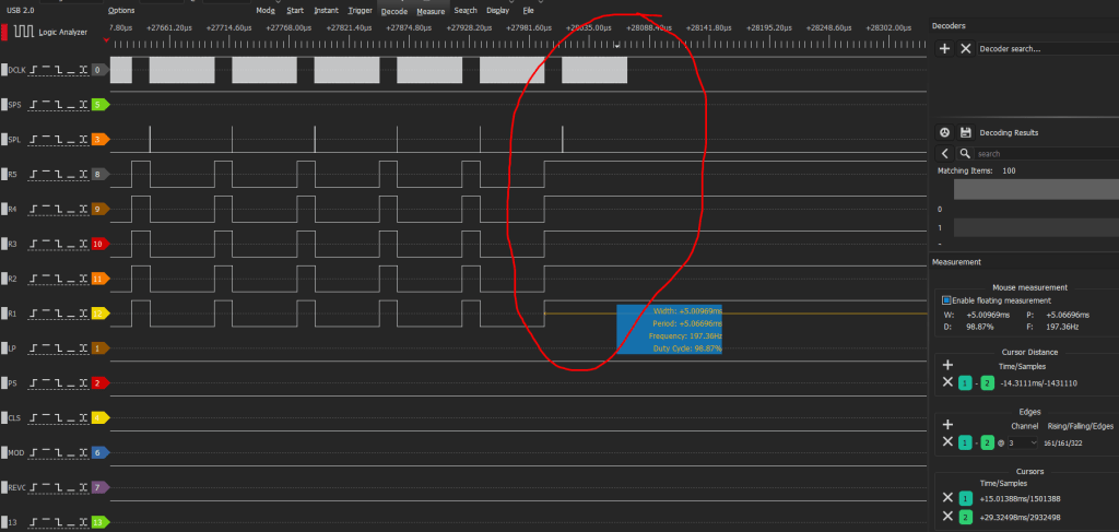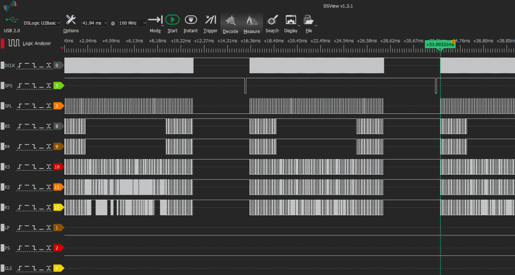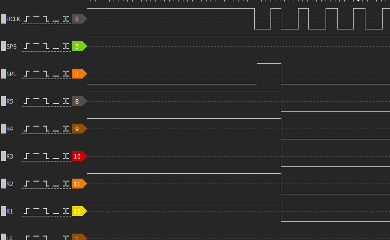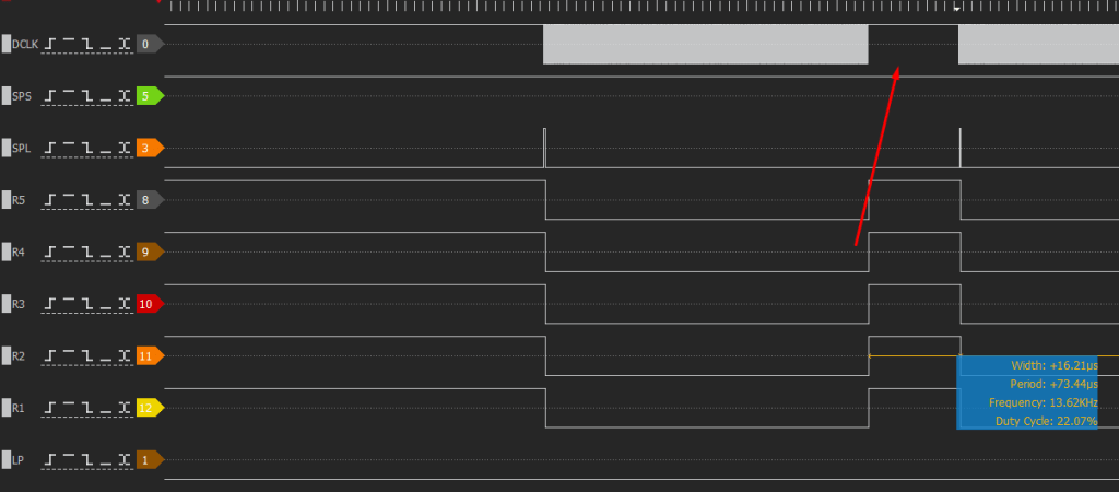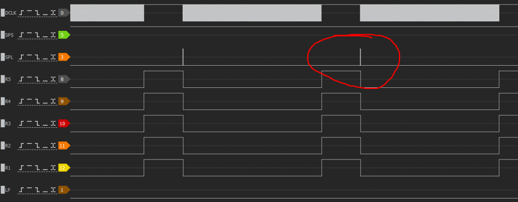 And we see below that the pixel clock pulses once for some reason when a new line begins, and then the normal pixels are drawn. Since all red bits are low, there is no red bits on the screen.