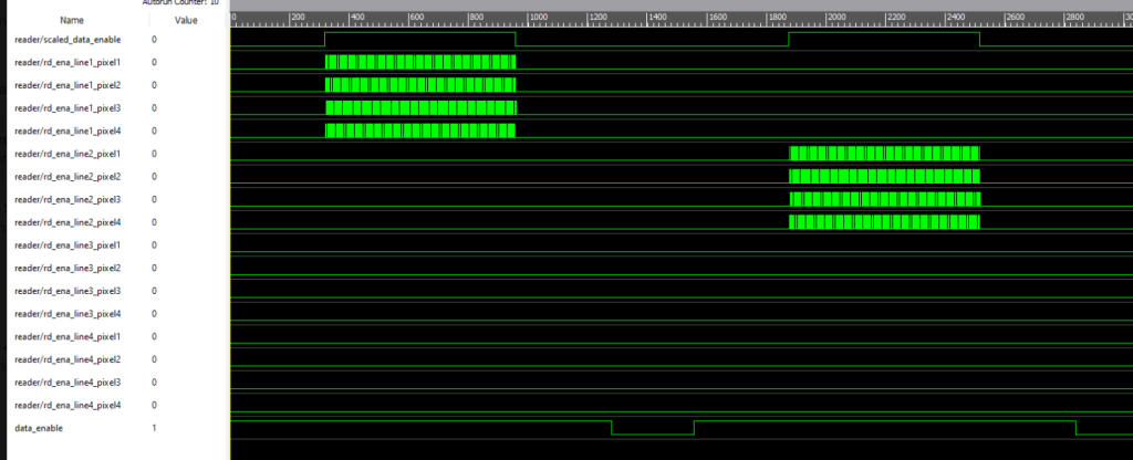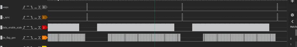So the active pixels coming in aren’t aligning with the output signal I am calling data_enable_scale, which is a signal that indicates the center of our output video on the screen, and not necessarily the data enable for 720P. We see they don’t align.